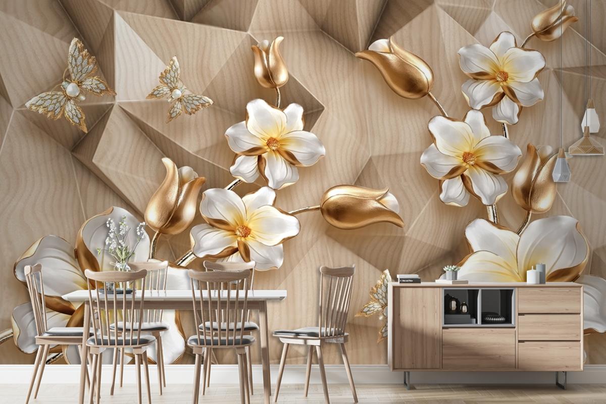 3 Boyutlu Arka Plan Altın Çiçekler Duvar Kağıdı