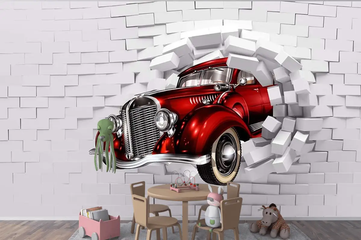 3D Boyutlu Duvardan Çıkan Kırmızı Araba Çocuk Odası Duvar Kağıdı