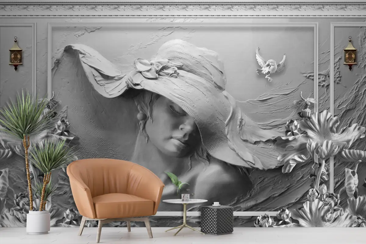 3D Duvar Kağıdı Şapkalı Kadın Kalıplı Gri Soyut Taş Arka Plan