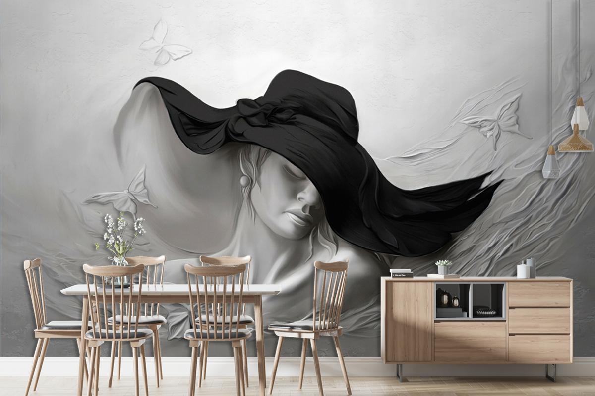 3D Duvar Kağıdı Siyah Şapkalı Kadın Gri Soyut Taş Arka Plan