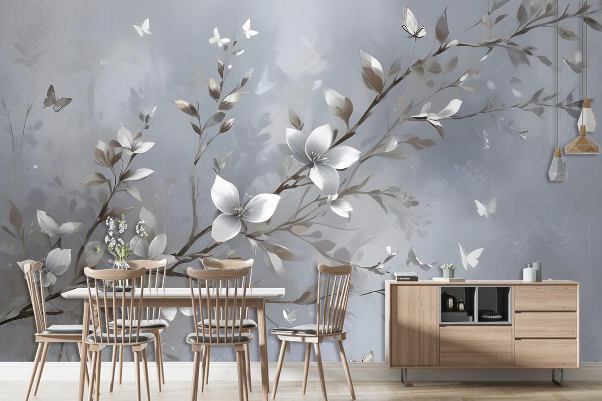 3D Kabartmalı Görünümlü Manolya Çiçeği Ve Kelebek Duvar Kağıdı