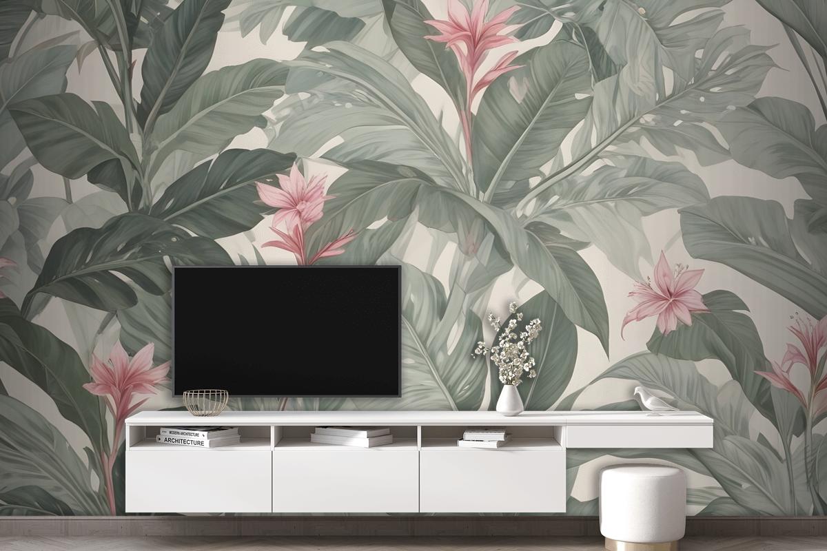 Açık Renkli Büyük Yeşil Yapraklar Pembe Çiçekler Tropikal Yaprak Desenli Oturma Odası Salon Duvar Kağıdı