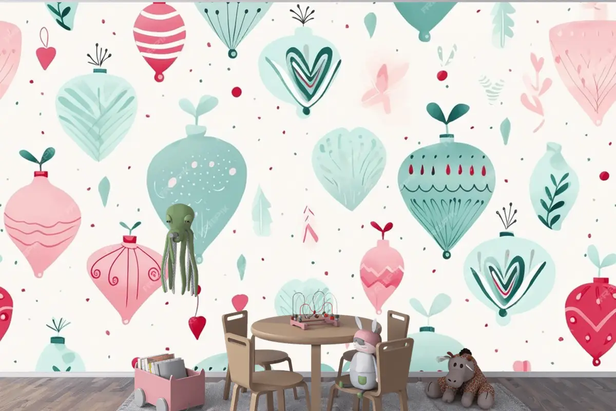 Ağaç Ve Süslerle Renkli Noel Kusursuz Deseni Modern Canlı Sonsuz Çocuk Odası Duvar Kağıdı