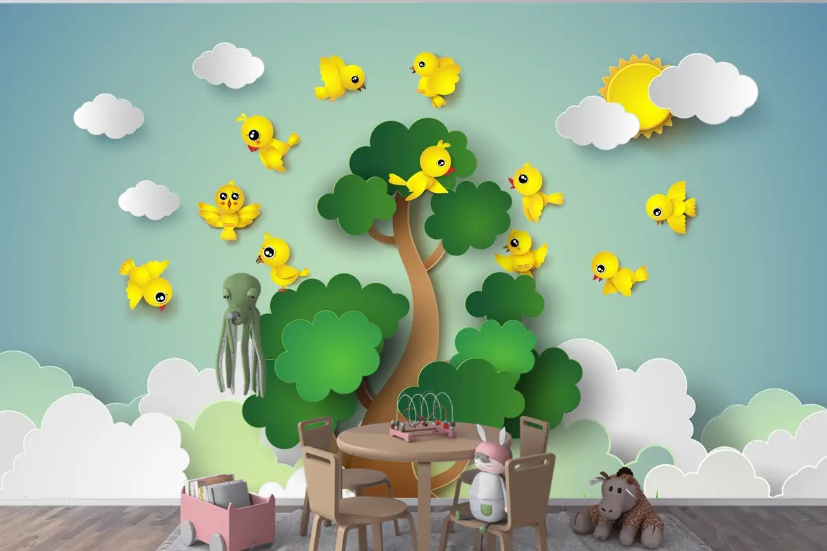 Ağacın Etrafında Uçan Kuş Çocuk Odası Duvar Kağıdı