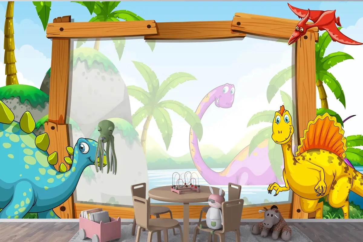 Ahşap Çerçeveli Dinozorlar Çocuk Odası Duvar Kağıdı