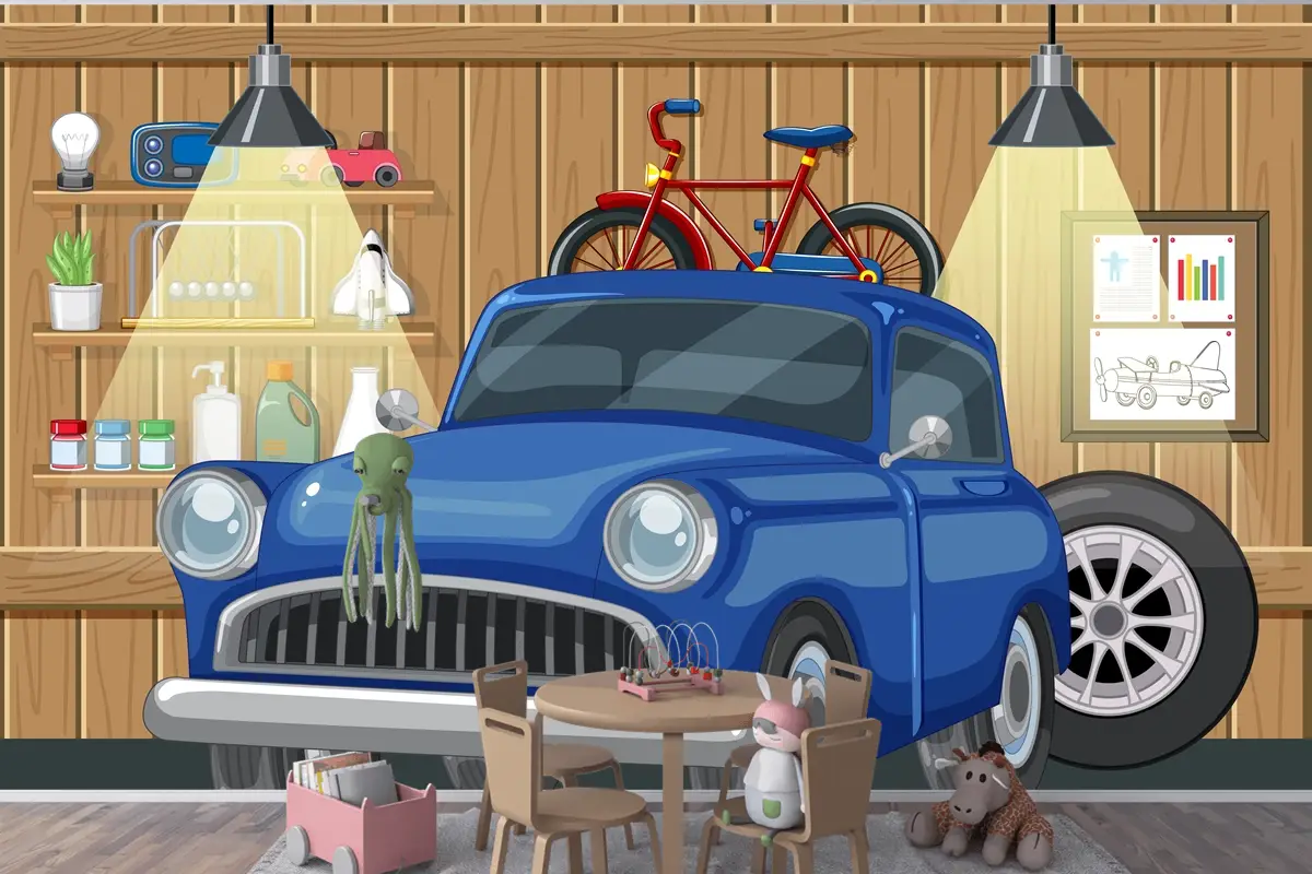 Ahşap Garajda Eski Model Araba Ve Bisiklet Çocuk Odası Duvar Kağıdı