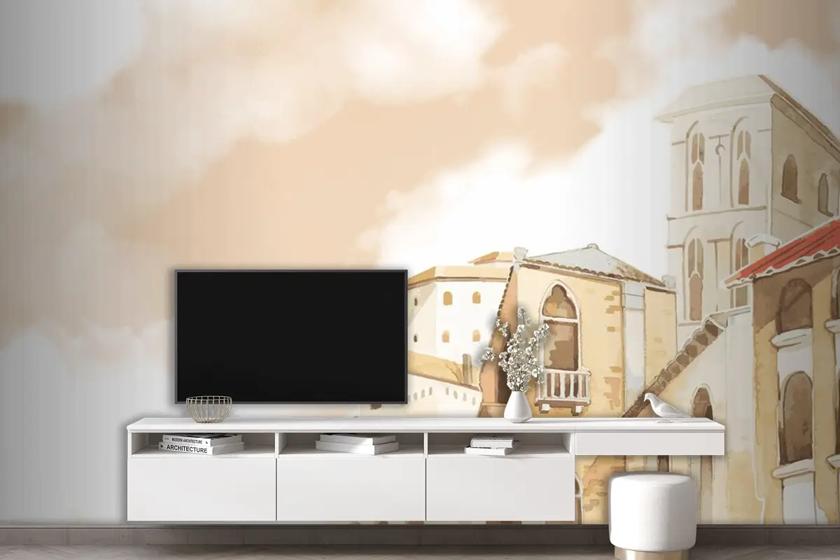 Akdeniz Şehir Binası Dış Su Renk Stili Oturma Odası Duvar Kağıdı