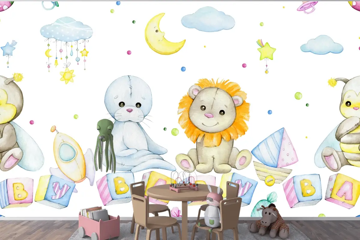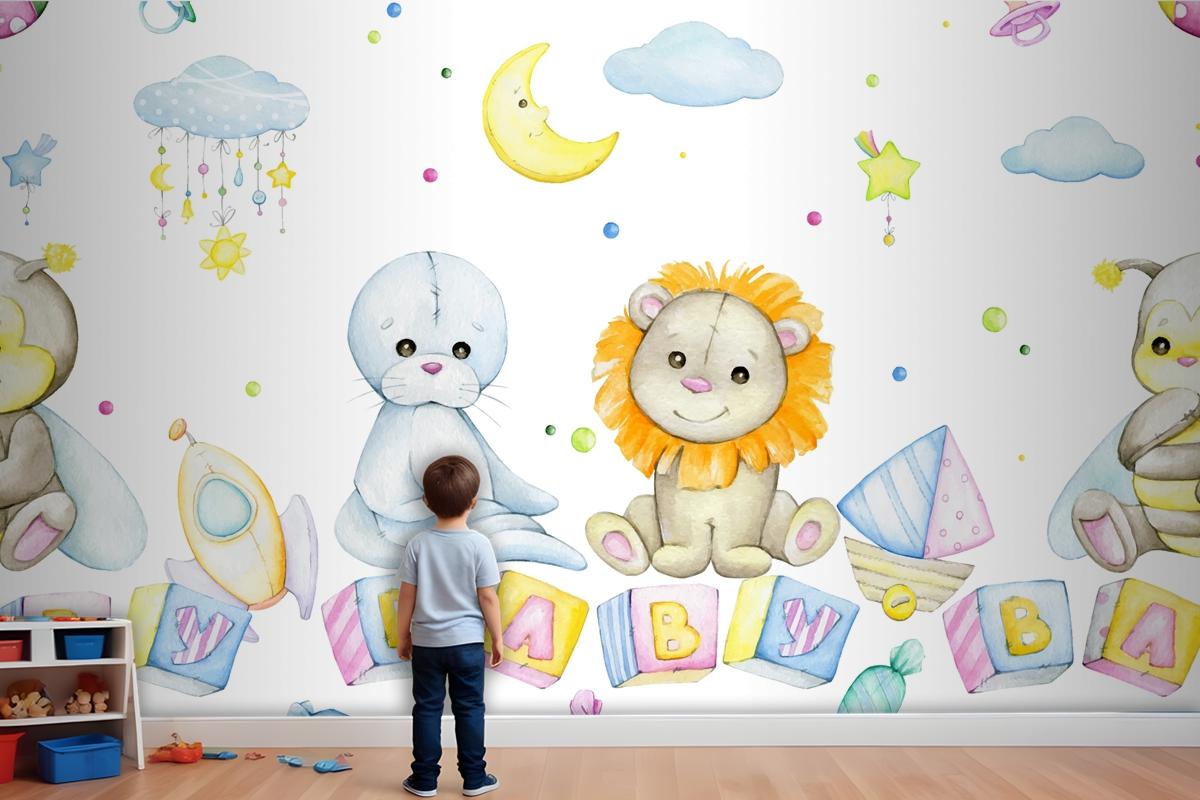 Arı Aslan Mühür Küpleri Harflerle Ay Yıldız Bulutlar Çocuk Odası Duvar Kağıdı