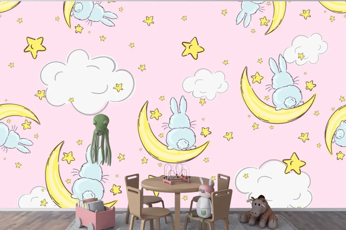 Ayların Ve Yıldızların Üzerinde Oturan Sevimli Tavşanlarla Gece Gökyüzü Doodle Deseni Sorunsuz Çocuk Odası Duvar Kağıdı