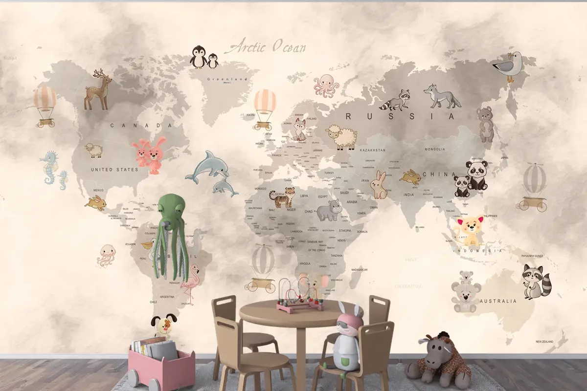 Bebek Hayvanlar Dünya Haritası Eğitici Çocuk Odası Duvar Kağıdı