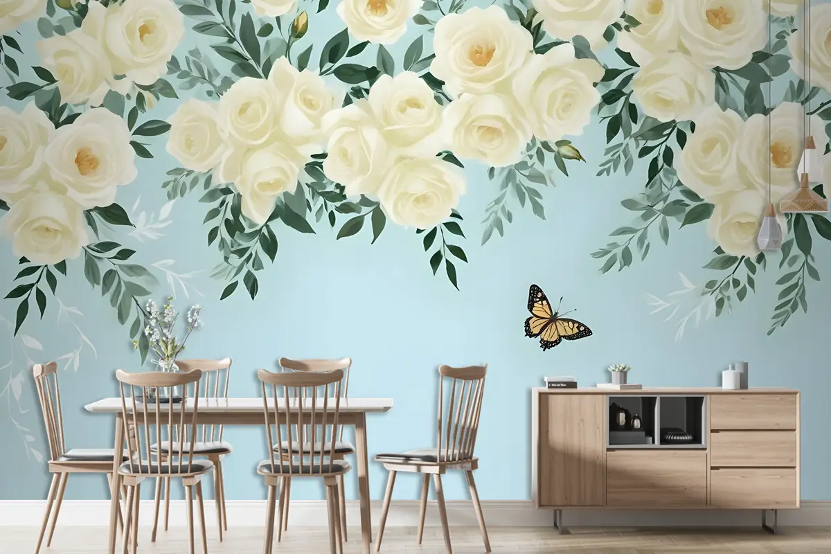 Beyaz Çiçekler Ve Sarı Kelebek Duvar Kağıdı