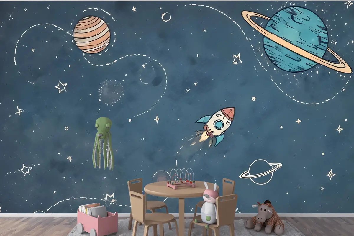 Beyaz Şerit Çocuk Odası Duvar Kağıdı Ile Parlayan Karikatür Uzay Çocuklar