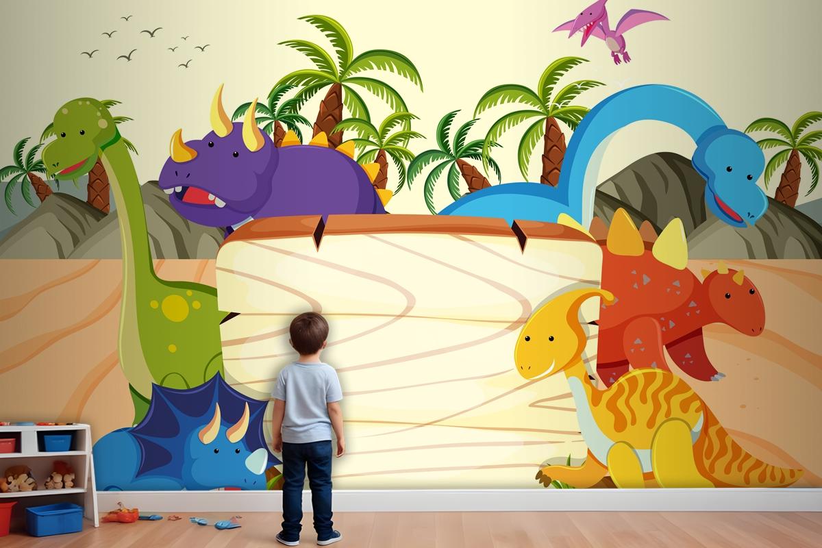 Bir Dinozor Ahşap Tahta Şablonu Çocuk Odası Duvar Kağıdı