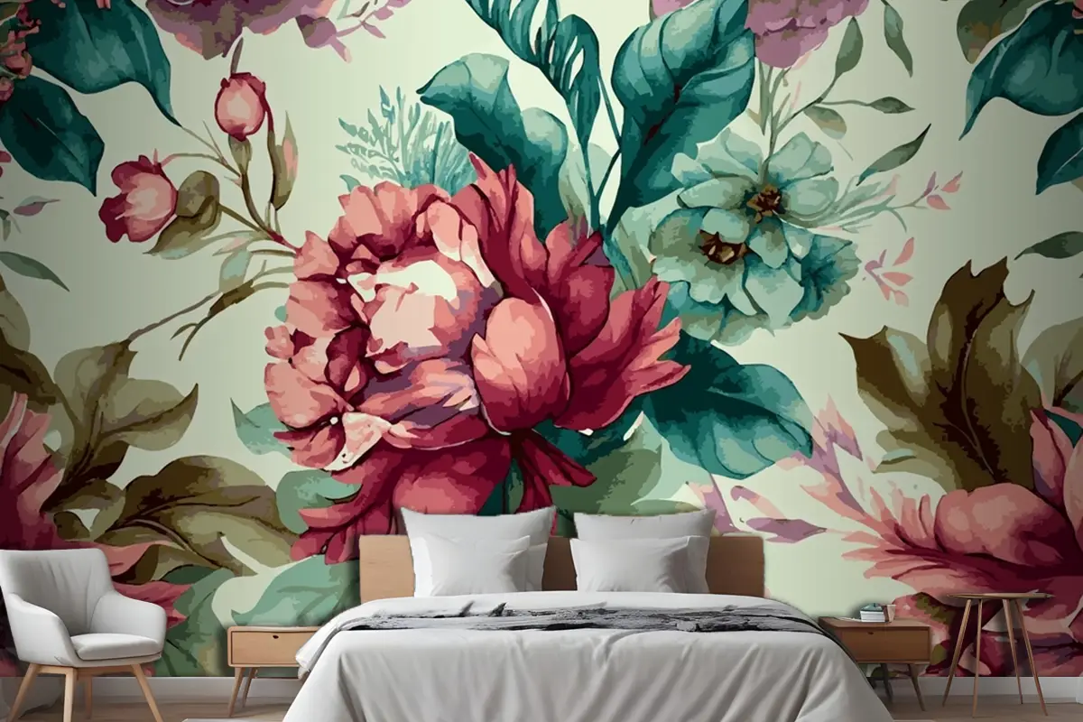 Botanik Suluboya Elle Çizilmiş Çiçekler Yatak Odası Duvar Kağıdı