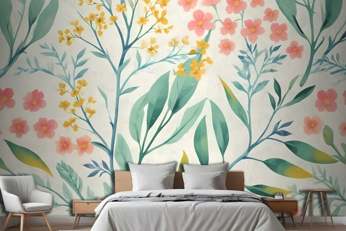 Botanik Yapraklı Suluboya Vintage Çiçekli Yatak Odası Duvar Kağıdı