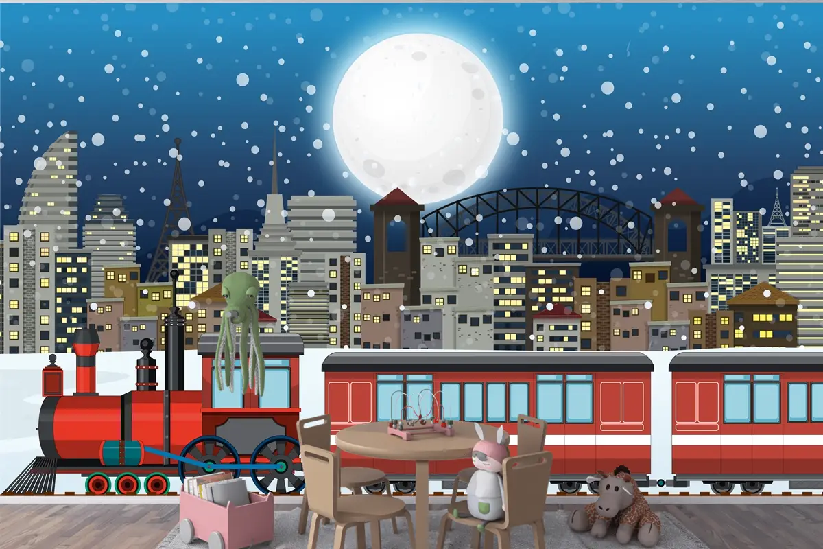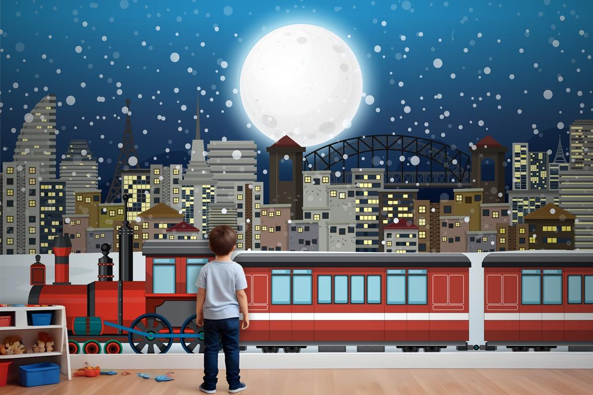 Buharlı Lokomotif Treni Ile Açık Hava Sahnesi Çocuk Odası Duvar Kağıdı