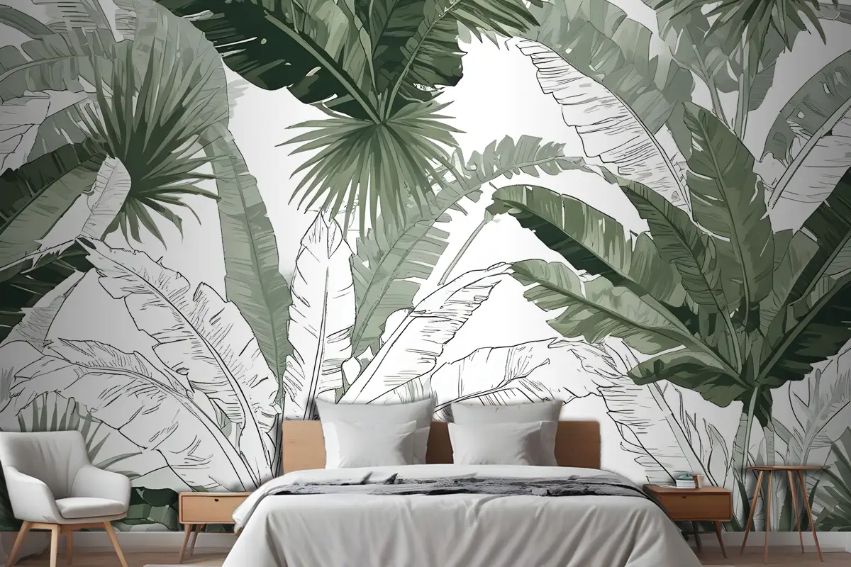 Büyük Tropikal Yapraklı Dikişsiz Desen Yatak Odası Duvar Kağıdı