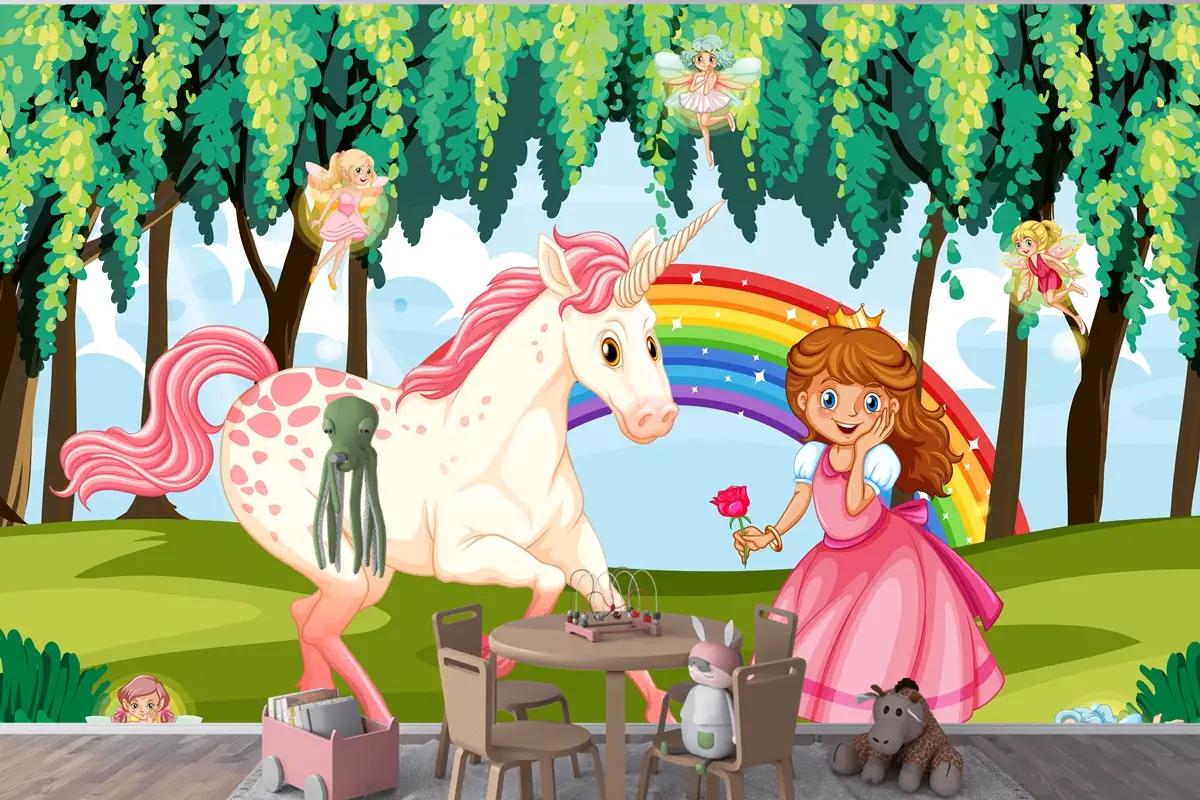 Büyülü Ormanda Prenses Ve Tek Boynuzlu At Arka Plan Çocuk Odası Duvar Kağıdı