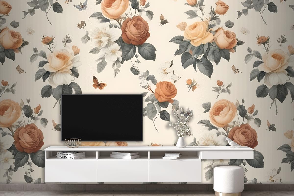 Çeşitli Gül Türleriyle Çiçek Desenli Oturma Odası Salon Duvar Kağıdı