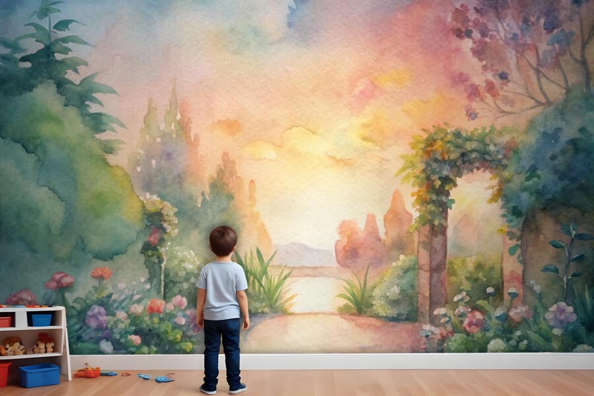 Çiçek Bahçesi Çocuk Odası Duvar Kağıdı İçeren Suluboya Arka Plan