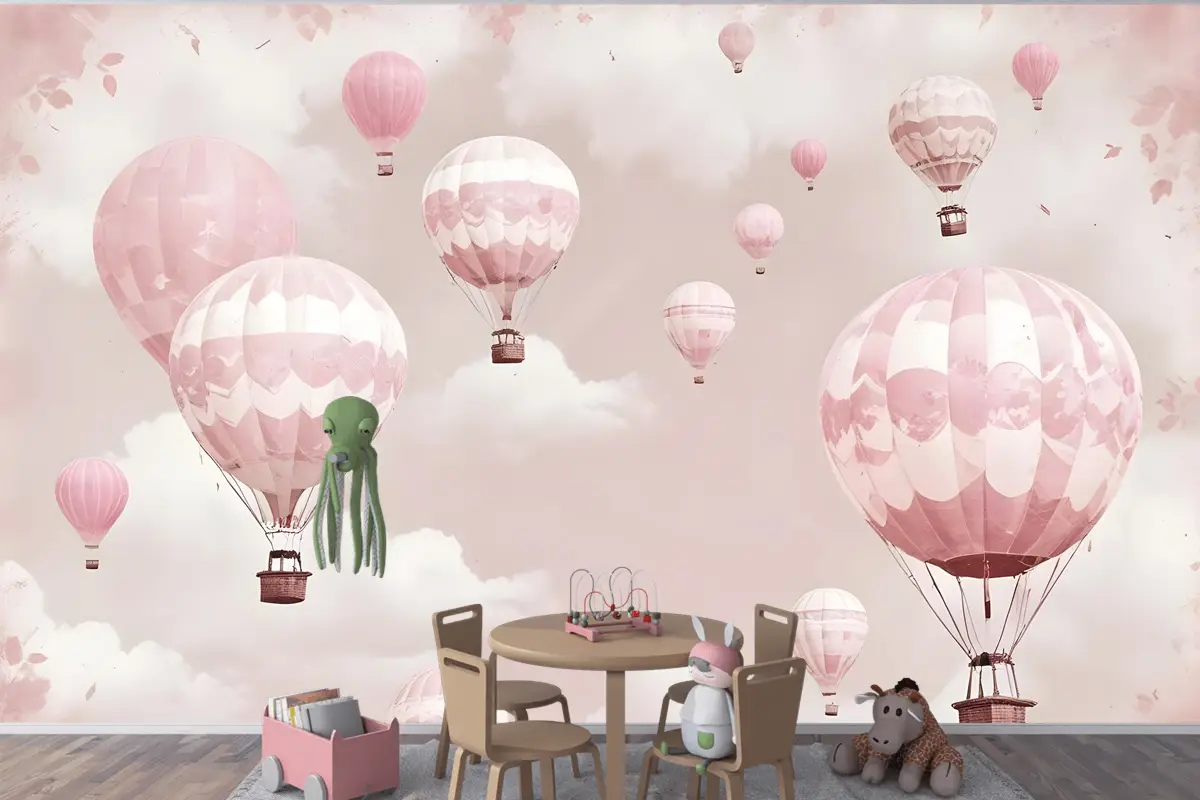 Çocuk Kız Sıcak Hava Balonu Çocuk Odası Duvar Kağıdı Duvar Pembe Gökyüzü