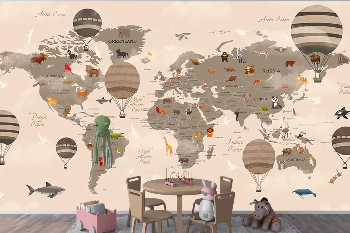 Çocuk Odaları Için Dünya Haritası Ve Balonlar Çocuk Odası Duvar Kağıdı