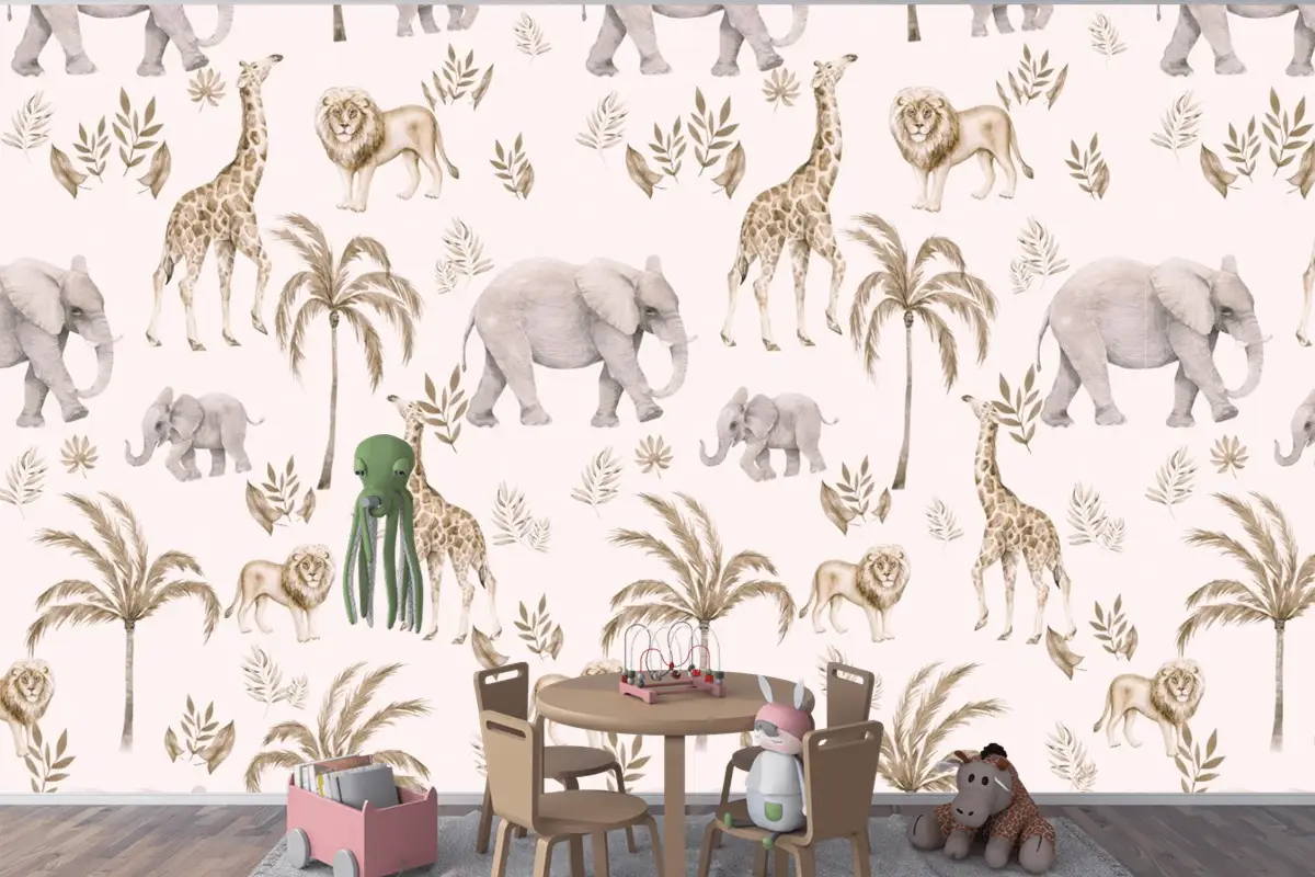 Çocuk Odası Bulutlu Çocuk Odası Duvar Kağıdı Palmiye Ağaçları Ve Safari Hayvanları