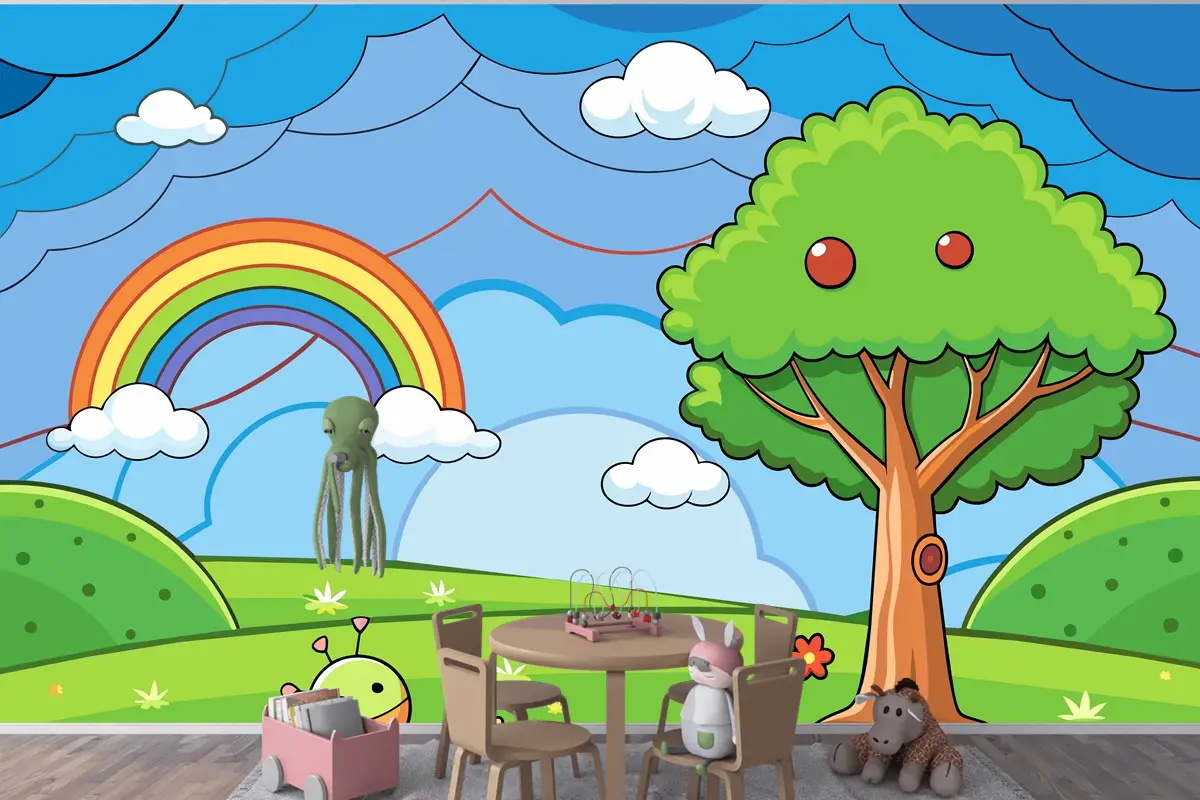 Çocuk Odası Duvar Kağıdı Nde Ağaç Ve Gökkuşağının Bulunduğu Renkli Bir Gökkuşağı Çizimi
