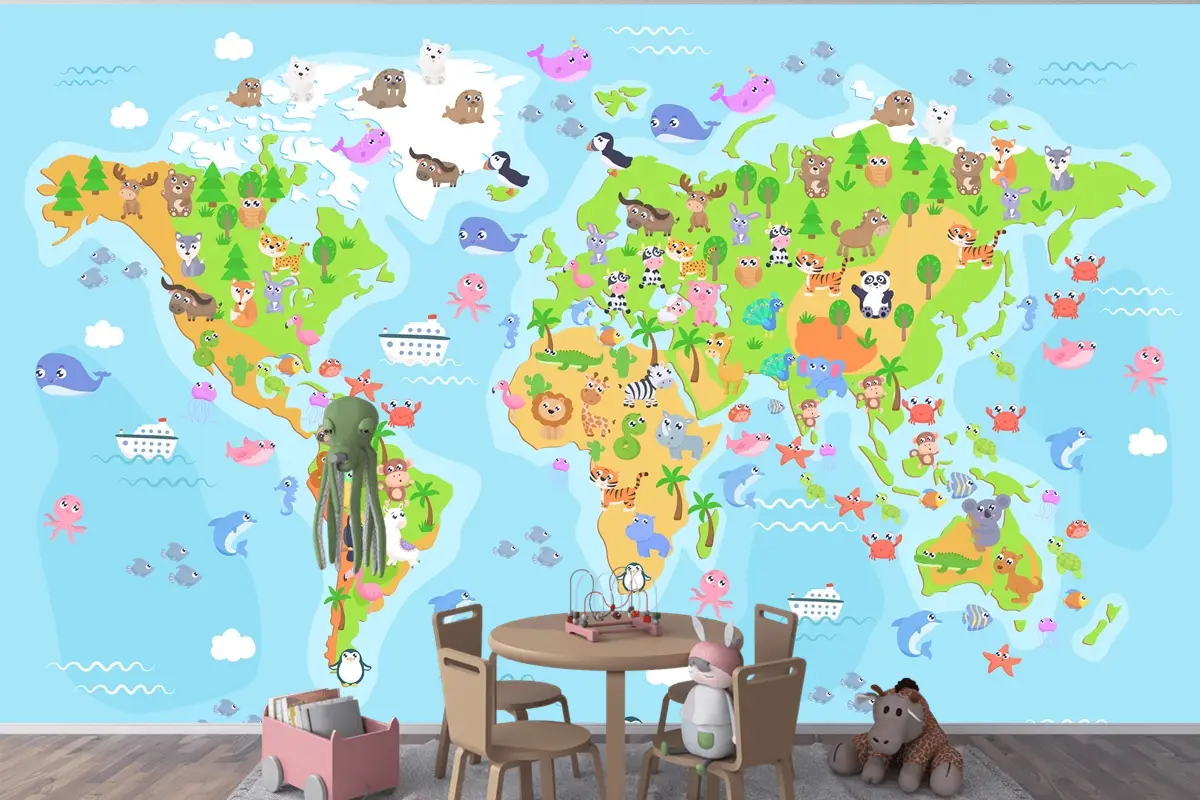 • Kendinden Yapışkanlı Çocuklar Için Hayvanlarla Dünya Haritası Çocuk Odası Duvar Kağıdı