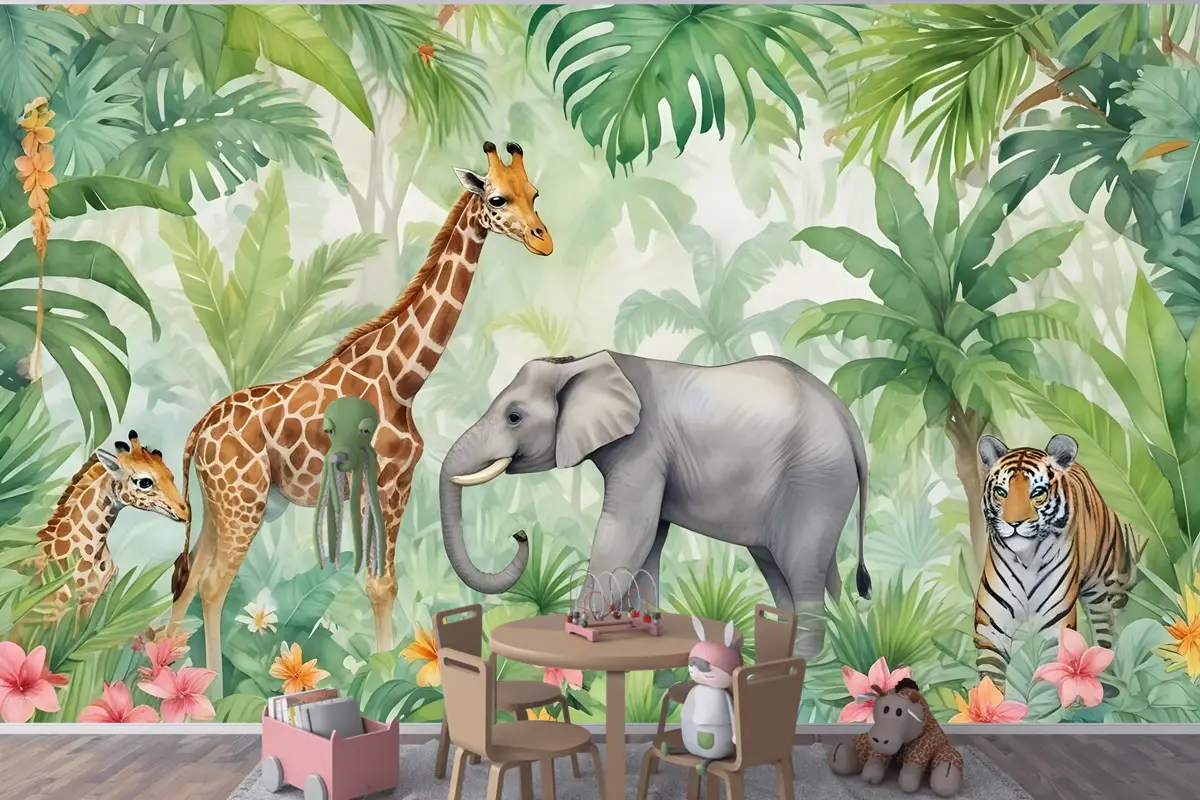 Çocuklar Safari Suluboya Tropikal Orman Orman Hayvanları Çocuk Odası Duvar Kağıdı
