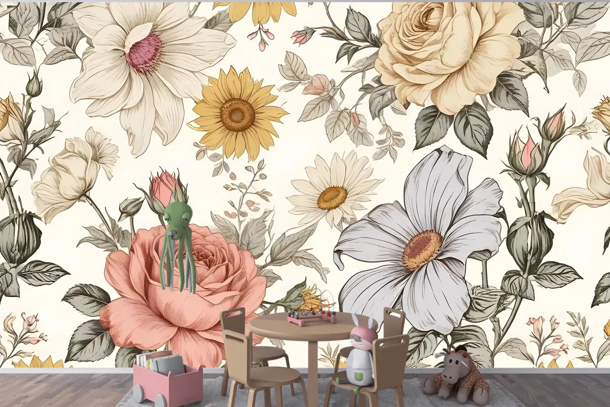 Çocuklar Şakayık Ve Papatya Çiçek Çocuk Odası Duvar Kağıdı