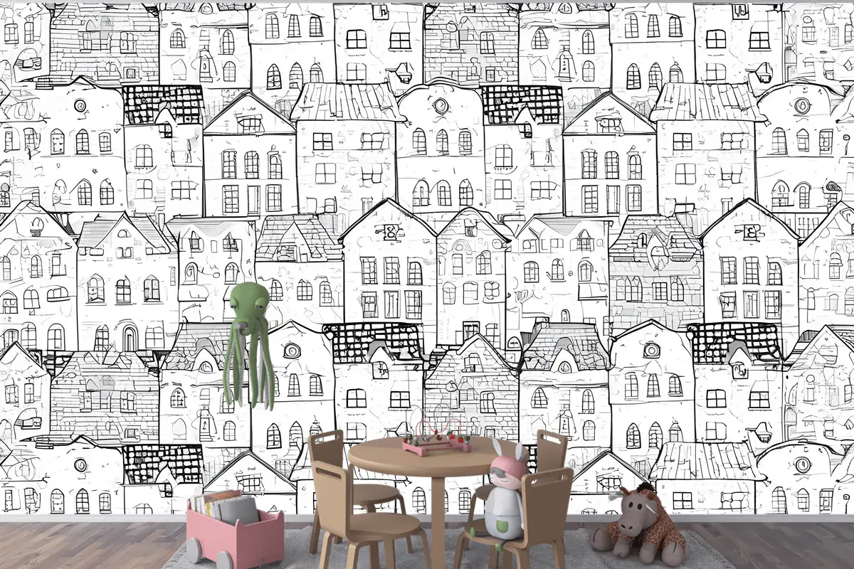 Çocuklar Siyah Beyaz Eskiz Ev Çocuk Odası Duvar Kağıdı