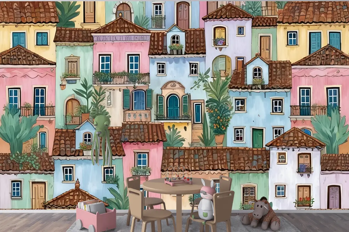 Çocuklar Suluboya Ortaçağ Evi Bitkilerle Çocuk Odası Duvar Kağıdı