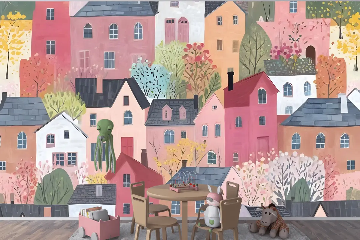 Çocuklar Suluboya Sevimli Kasaba Evi Çocuk Odası Duvar Kağıdı