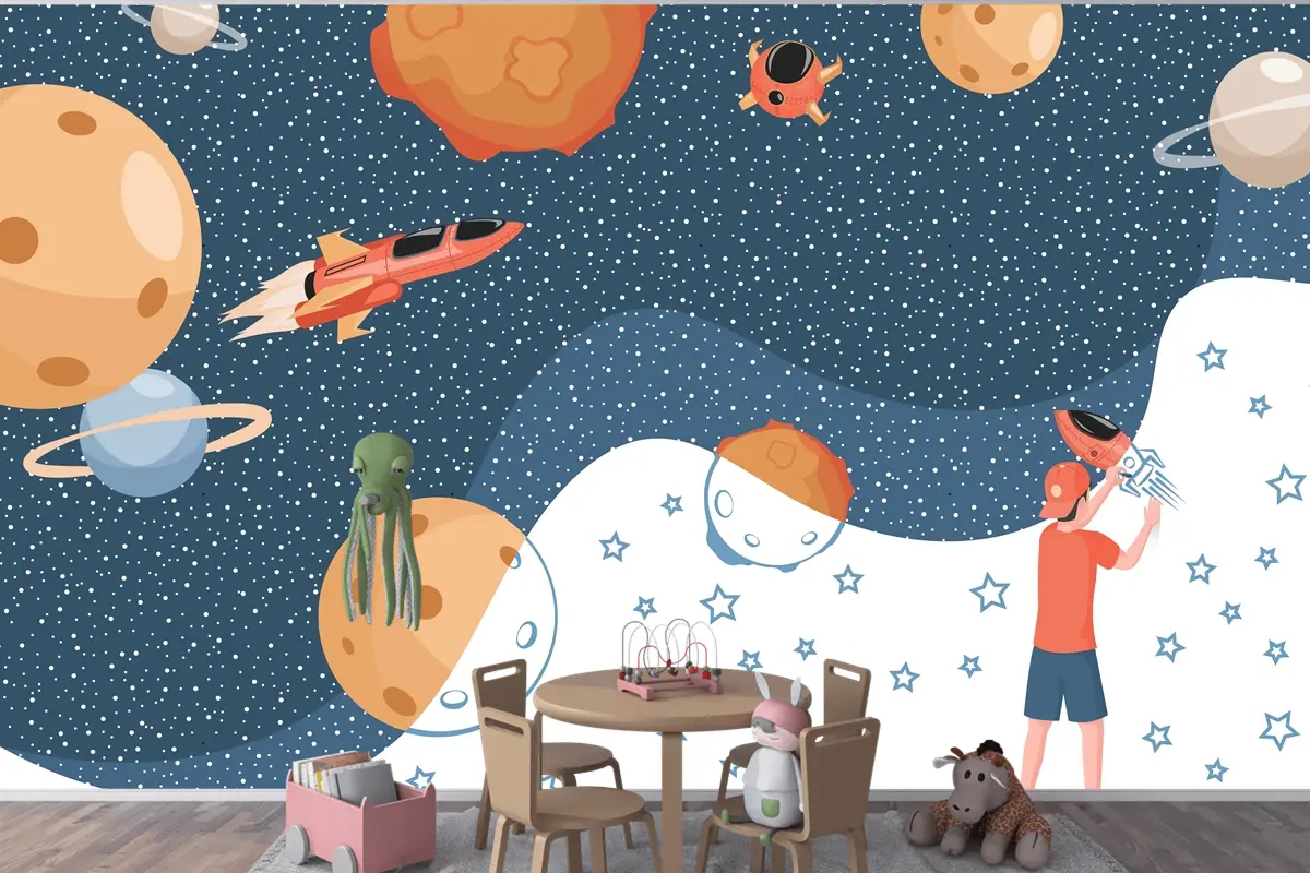 Cosmos Gezegenler Uzay Gemileri Ve Yıldızlar Çizim Çocuk Odası Duvar Kağıdı