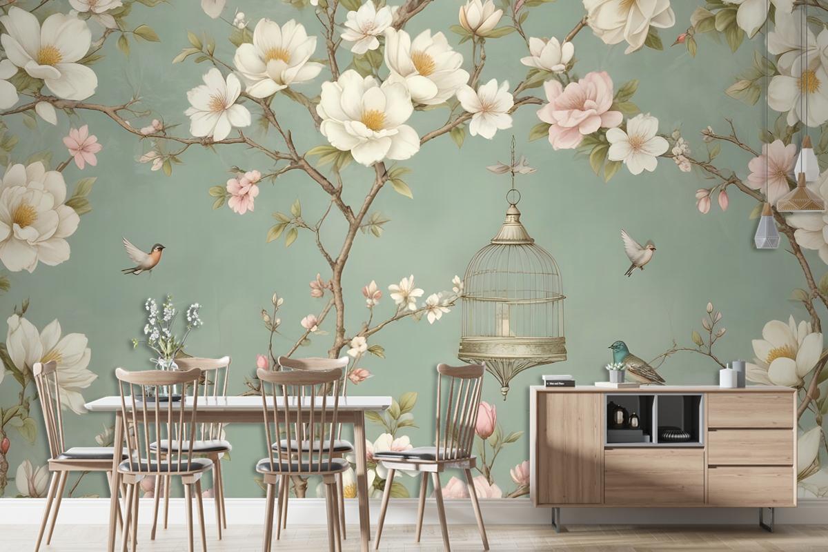 Dallar, Çiçekler Ve Kuşlar Ile İngiliz Country Tarzı Duvar Kağıdı