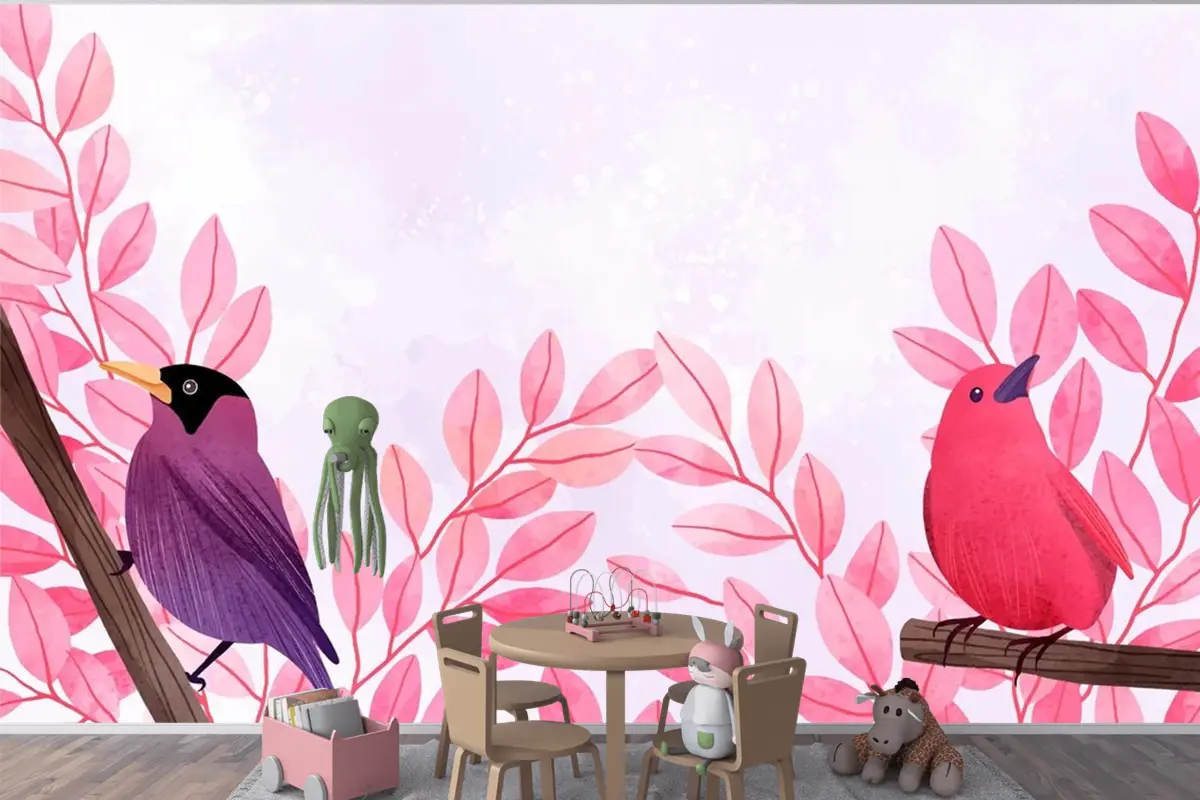 Dallarda Oturan Kuşların Güzel Suluboya Çocuk Odası Duvar Kağıdı