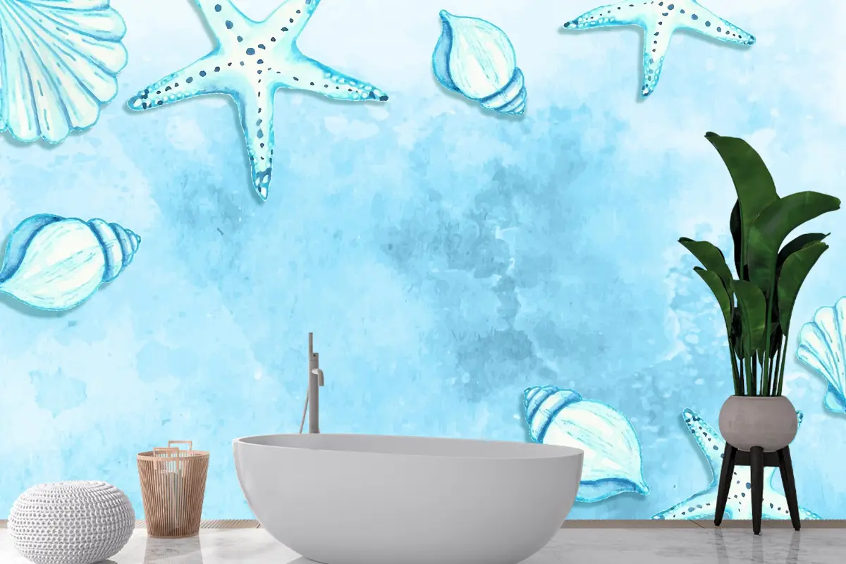 Denizyıldızı Ve Kabukları Ile Suluboya Yaz Arka Plan Banyo Duvar Kağıdı