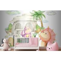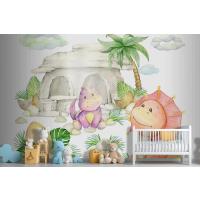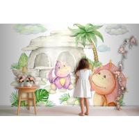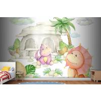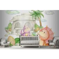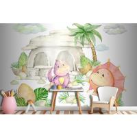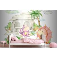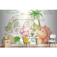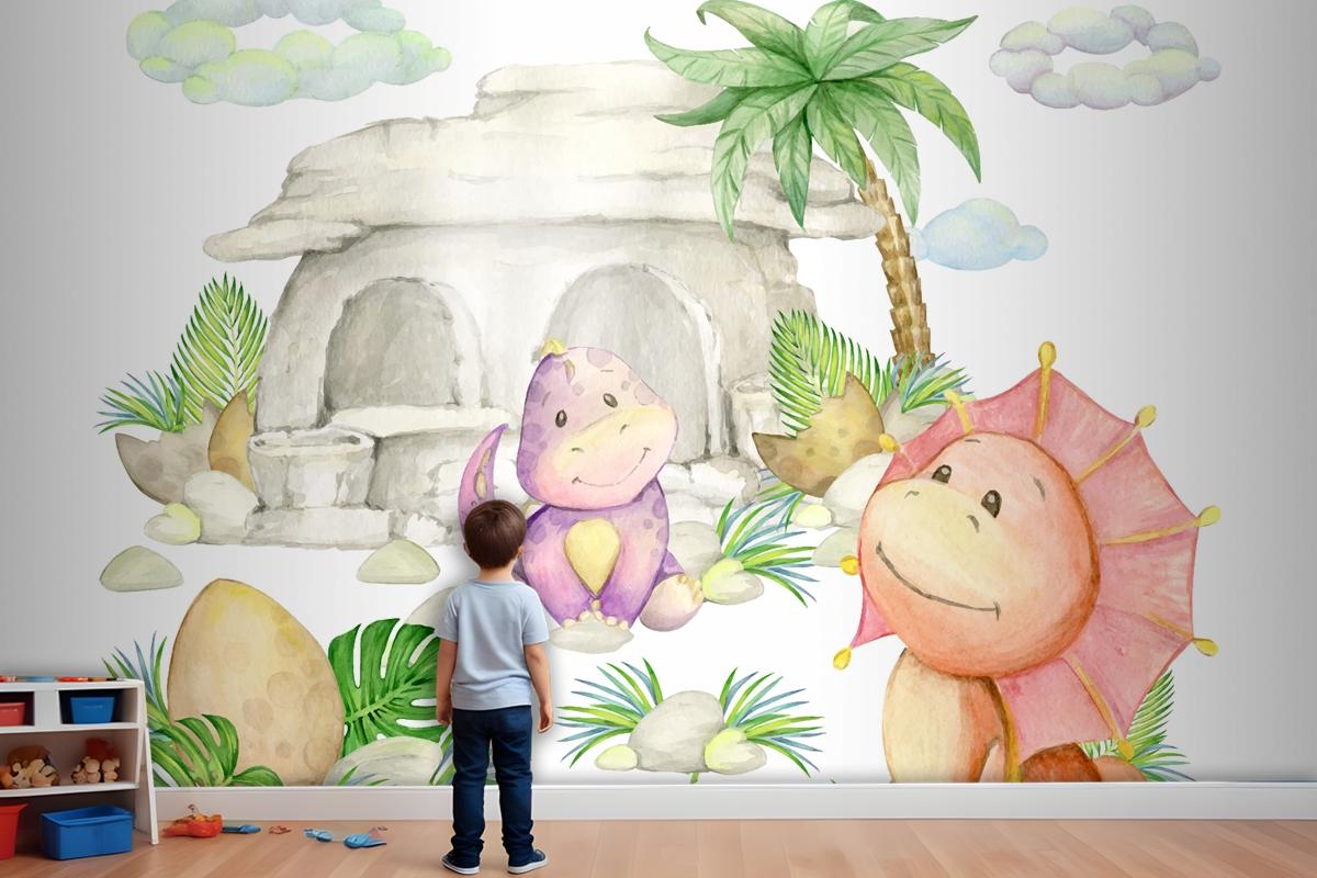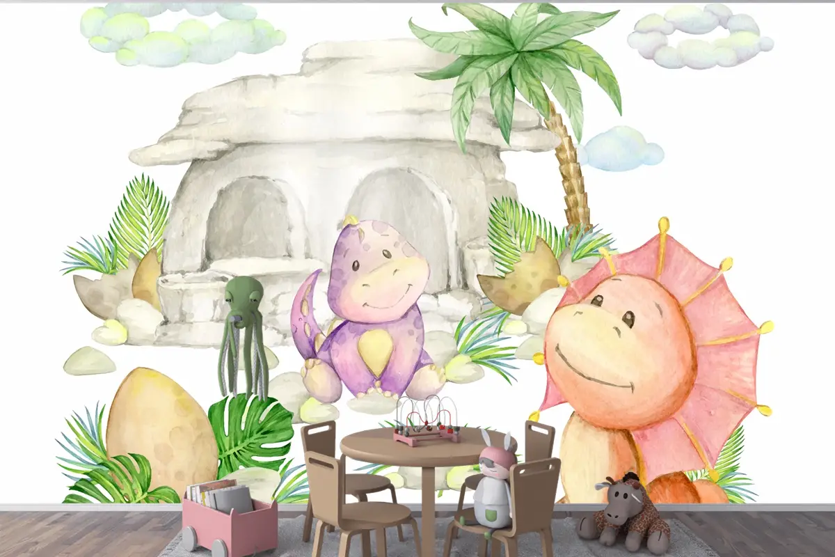 Dinozorlar Bir Taş Ev Bir Palmiye Ağacı Çocuk Odası Duvar Kağıdı