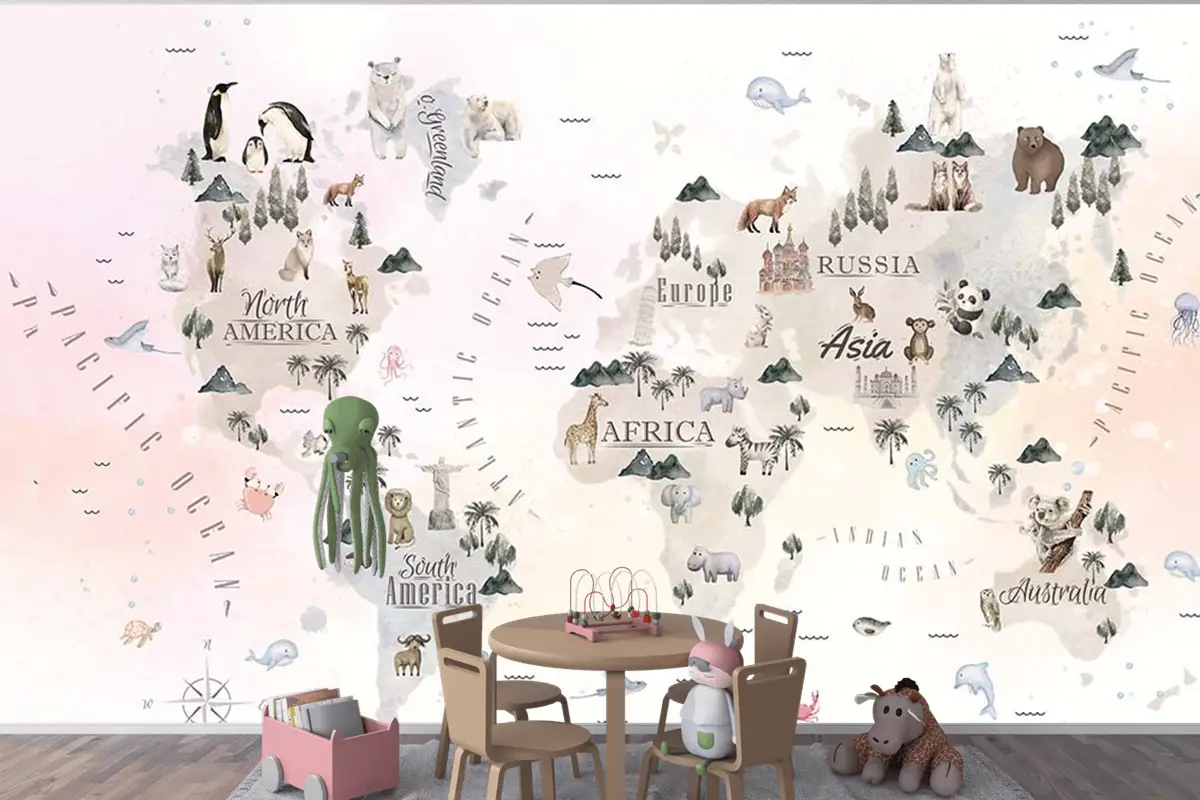 Dünya Üzerinde Sevimli Hayvanlar Çocuk Odası Duvar Kağıdı