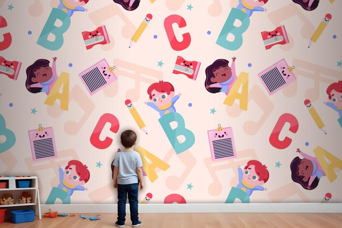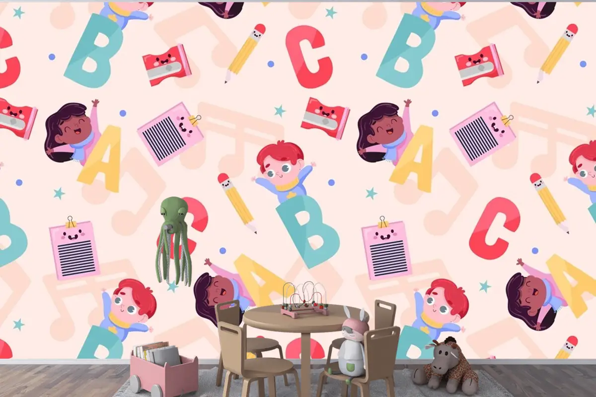 Düz Okula Dönüş Desen Tasarımı Çocuk Odası Duvar Kağıdı