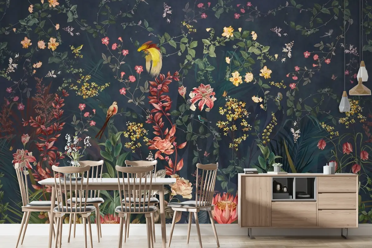 Egzotik Kuşlar Ve Çiçeklerle Vintage Çiçekli Duvar Kağıdı