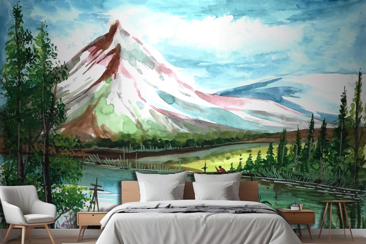 El Çizimi Bahar Manzara Sahnesi Suluboya Yatak Odası Duvar Kağıdı