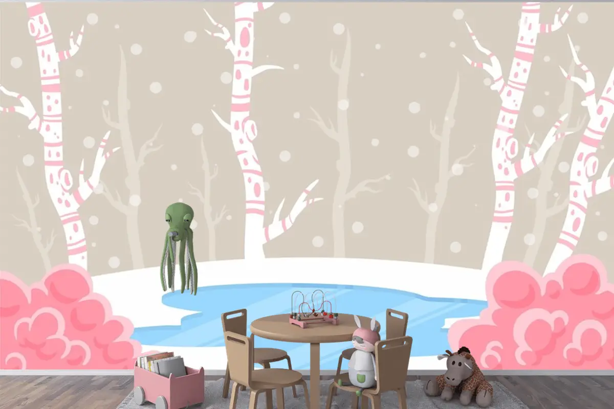 El Çizimi Çocuk Odası Duvar Kağıdı Duvarında Kış Konsepti