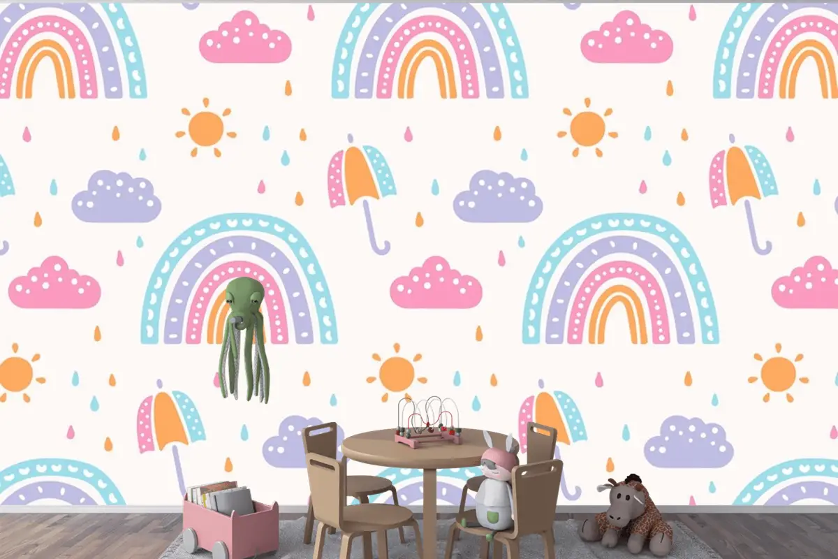 Elle Çizilmiş Gökkuşağı Desen Tasarımı Çocuklar Çocuk Odası Duvar Kağıdı