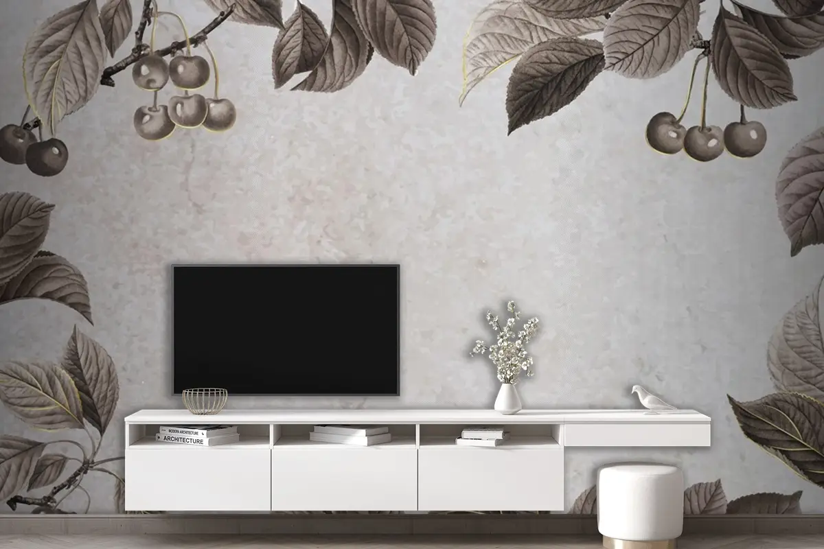 Elle Çizilmiş Kiraz Desenli Çerçeve Oturma Odası Duvar Kağıdı