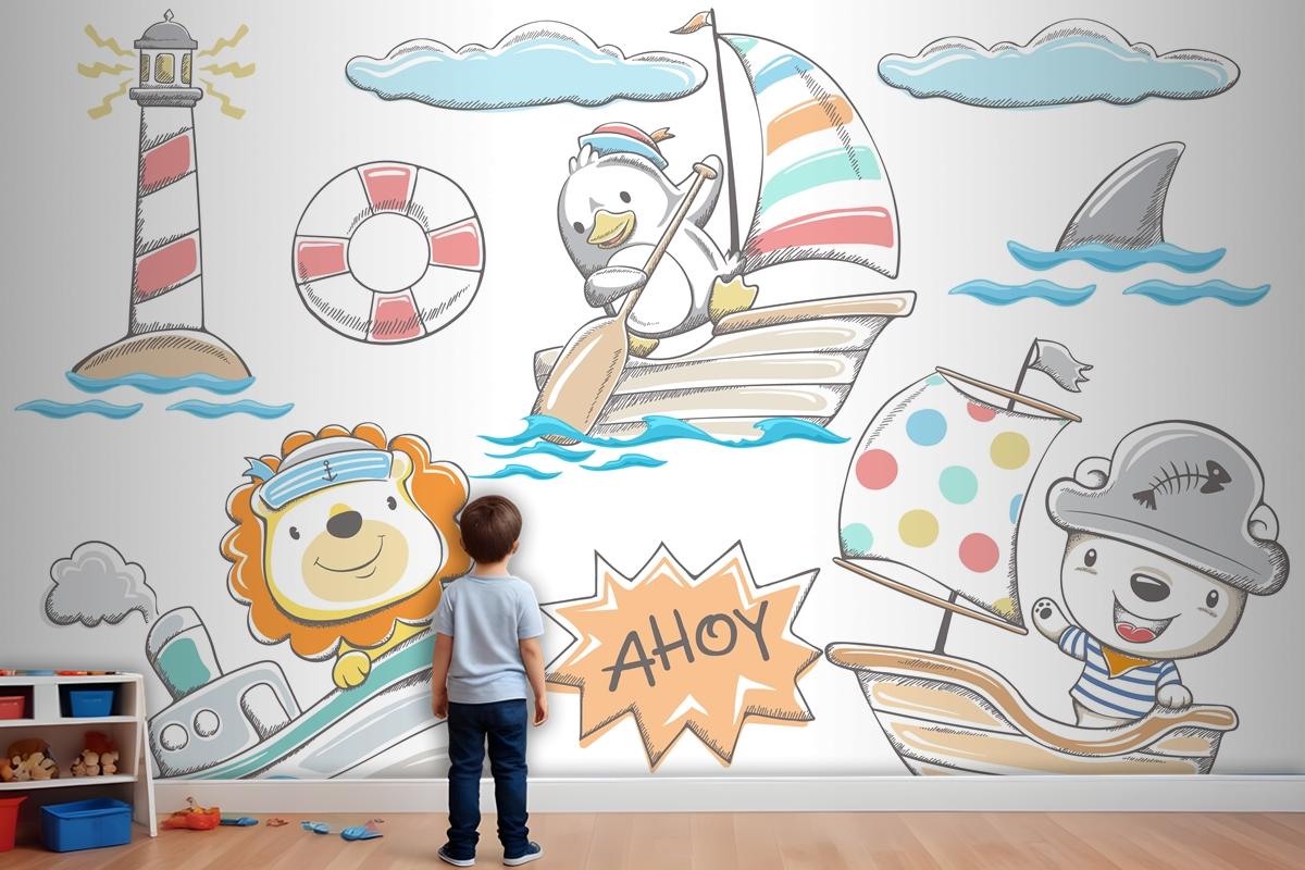 Elle Çizilmiş Komik Hayvanlar Deniz Elementleri Çocuk Odası Duvar Kağıdı