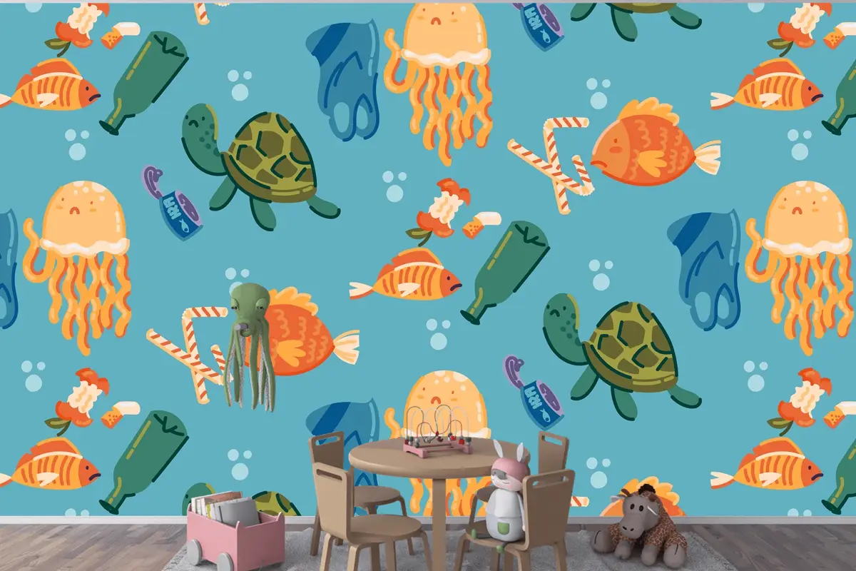 Elle Çizilmiş Okyanusları Kurtar Desen Çocuk Odası Duvar Kağıdı