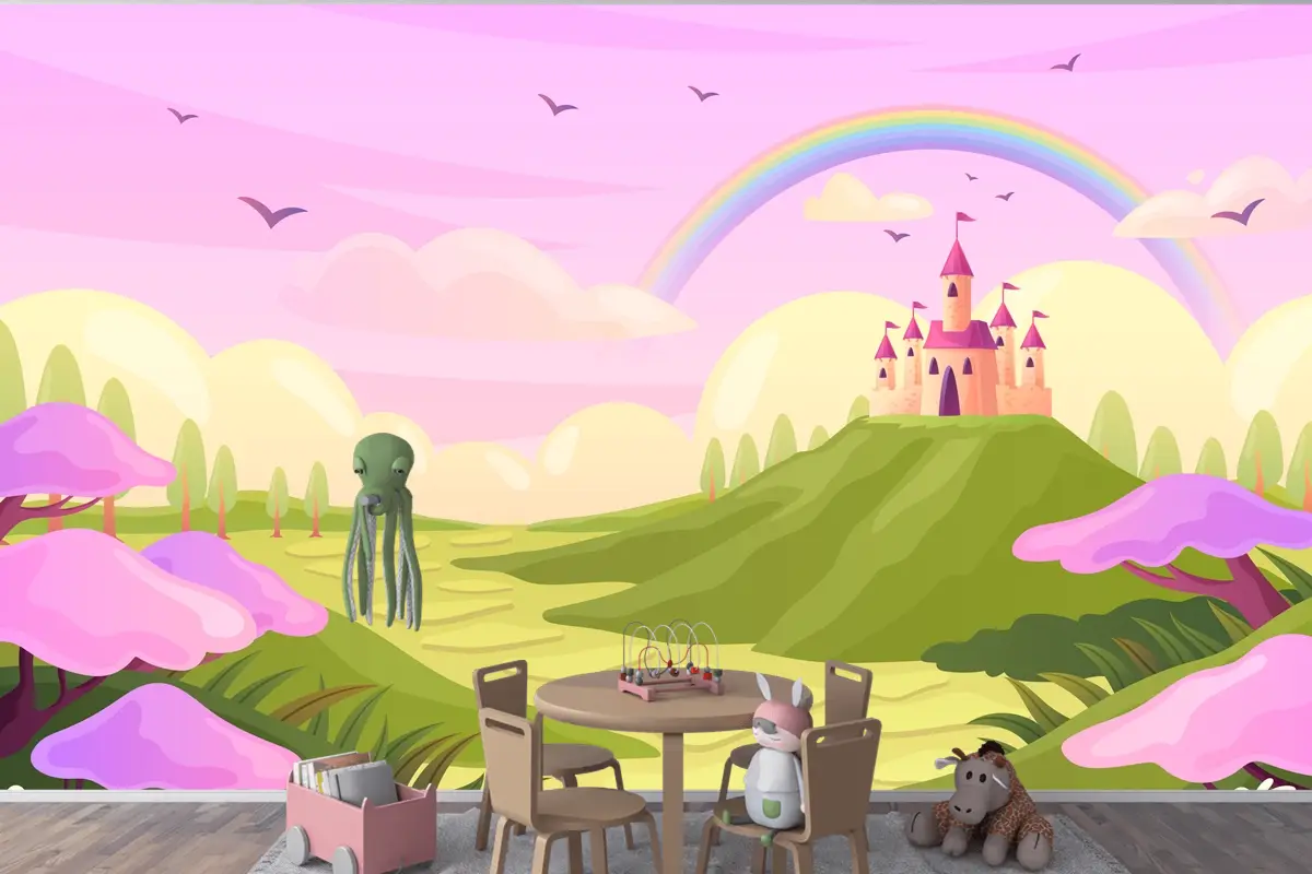 • Kendinden Yapışkanlı Elle Çizilmiş Peri Masalı Arka Plan Çocuk Odası Duvar Kağıdı