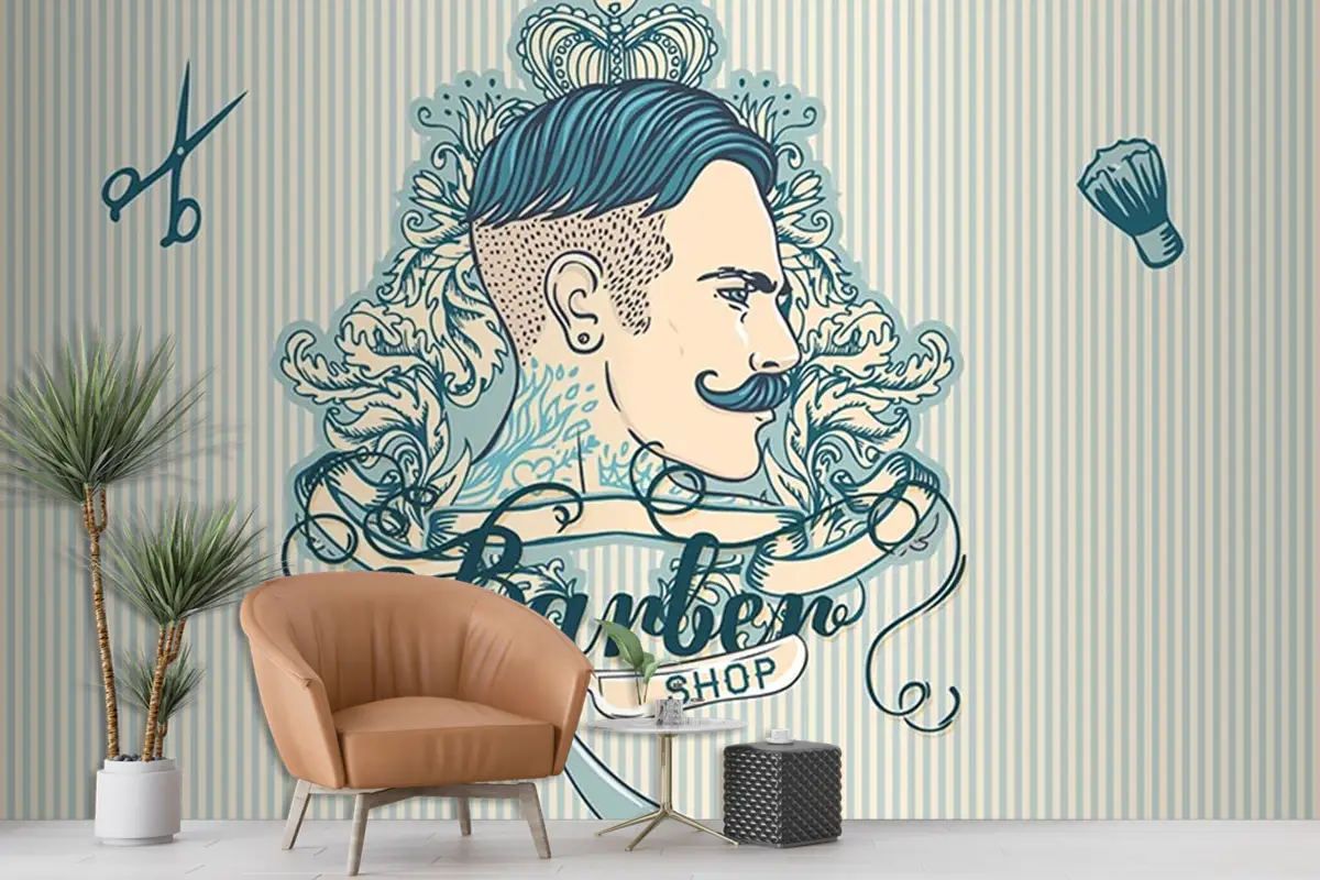 Erkek Kuaför Salonu Mavi Çizgili Duvar Kağıdı